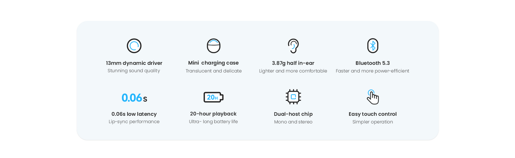 - Bluetooth 5.3 chip: 0.06-second delay, stronger anti-interference ability